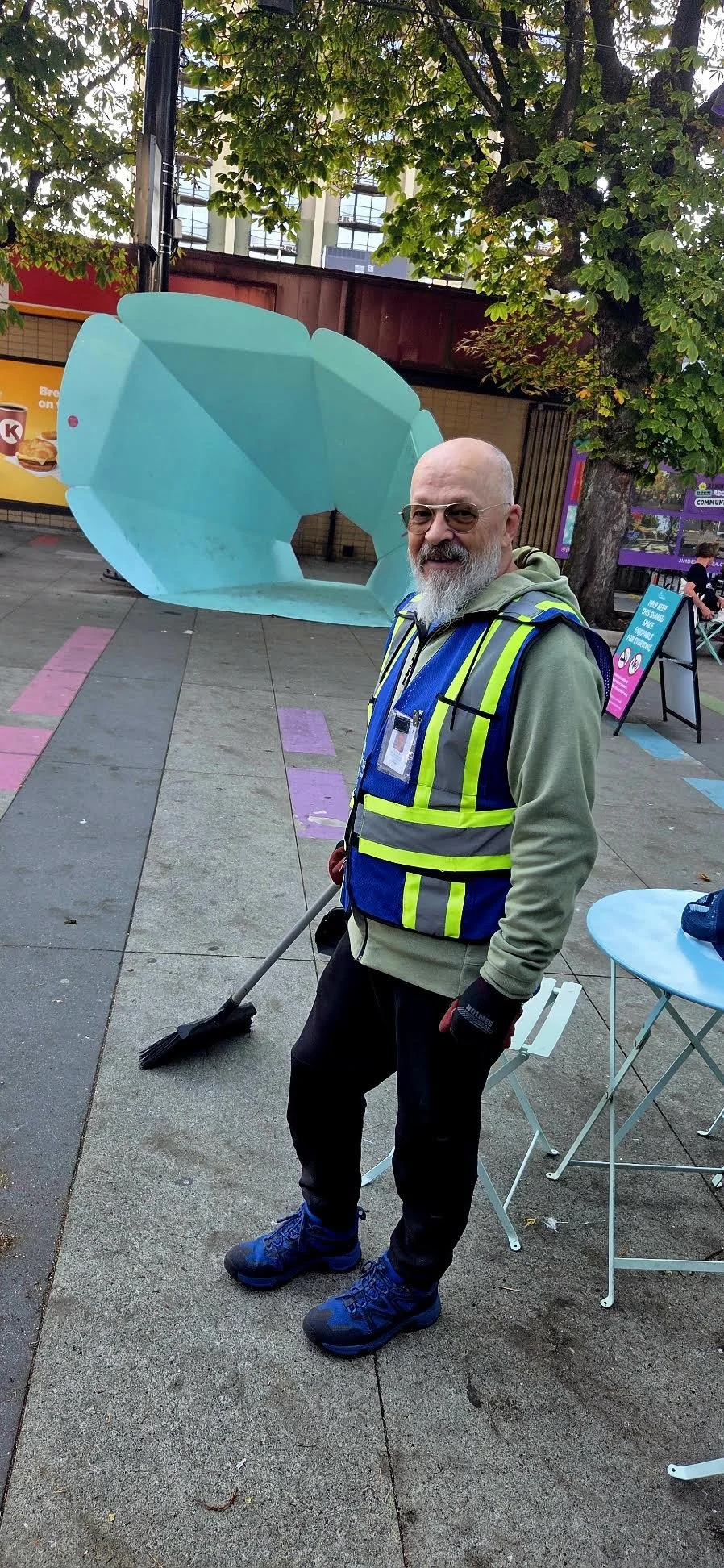 I meet Randy Keats on a sunny morning, at his place of work, putting out the tables and chairs ready for the day ahead. A big grin on his face; his bright work vest proclaiming him the guardian of the Jim Deva Plaza. He walks over to me, and it's soon apparent that his personality is as big as his smile.