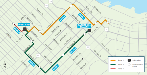 Route 1 from Gastown will basically travel under Pender Street, up Burrard, make a right up Barclay, left on Thurlow, and a right into Nelson Park connecting to the new substation.