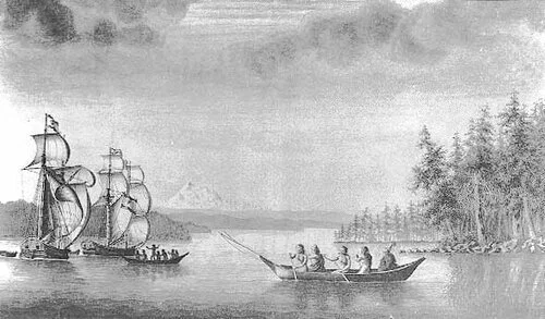 THE SHIPS SUTIL AND MEXICANA, DURING THE DIONISIO ALCALÁ GALIANO EXPEDITION IN 1792 IN BRITISH COLUMBIA. DRAWING BY JOSE CORDERO